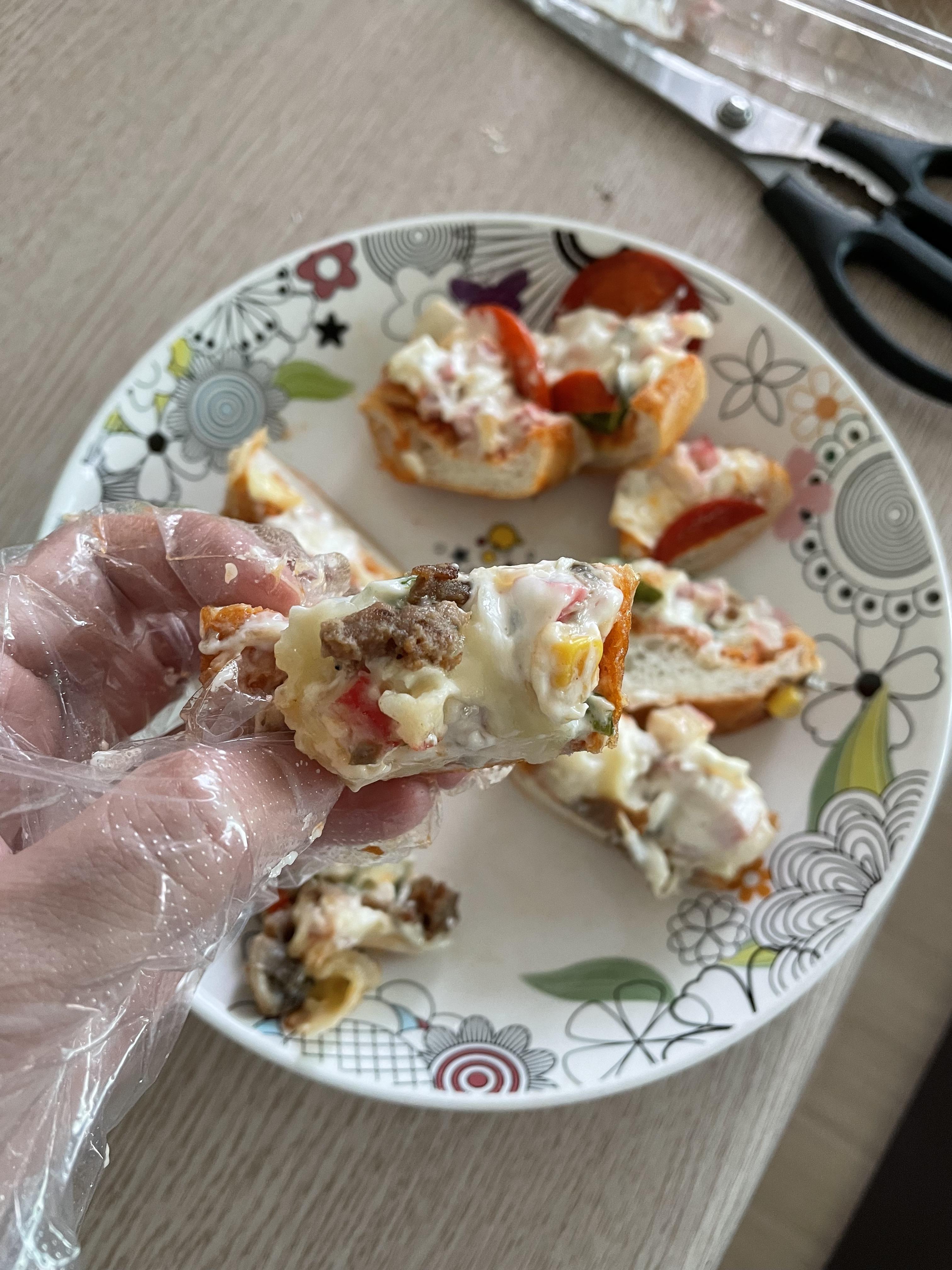 가위로 자르시는편이 좋습니다. 생각보다 바게트가 눅눅하면서 질겨염.... 바삭하다거나 부드럽다면 빵칼로도 가능할거같은데요. ㅎㅎ