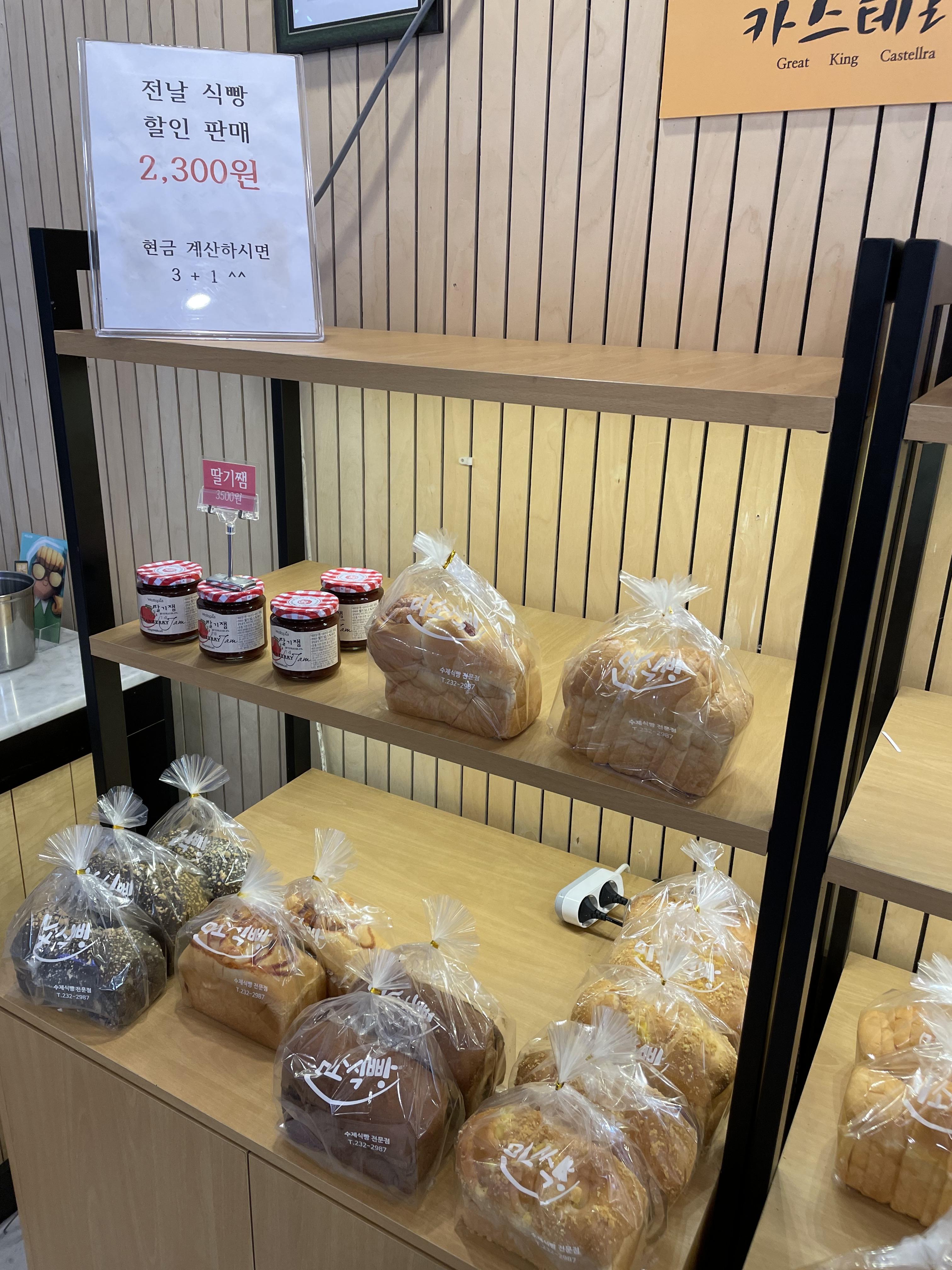 식빵은 대부분 3,300원입니다. 전날식빵은 2,300원이고 현금계산시 3+1행사도 겸하고 있네요.