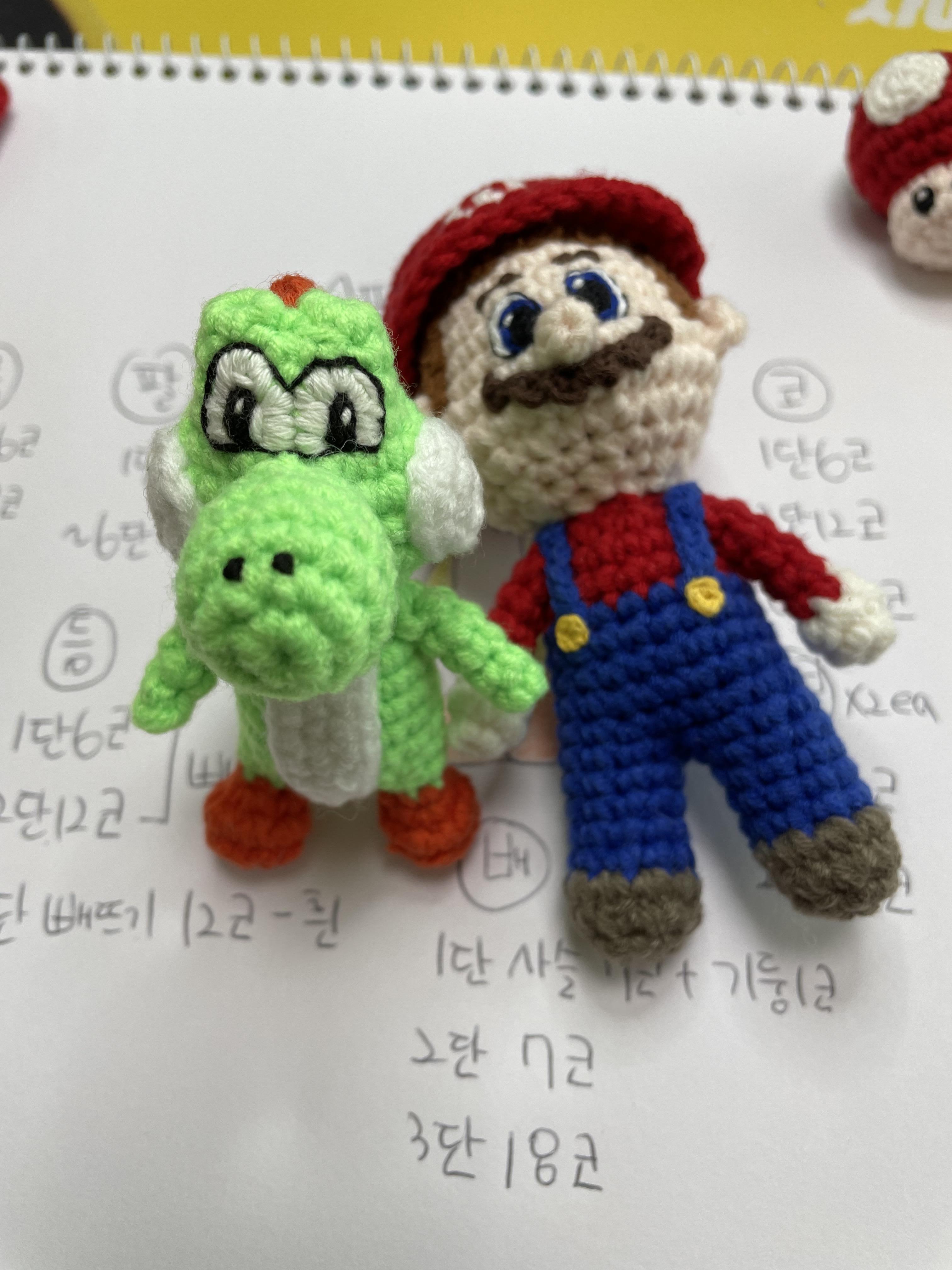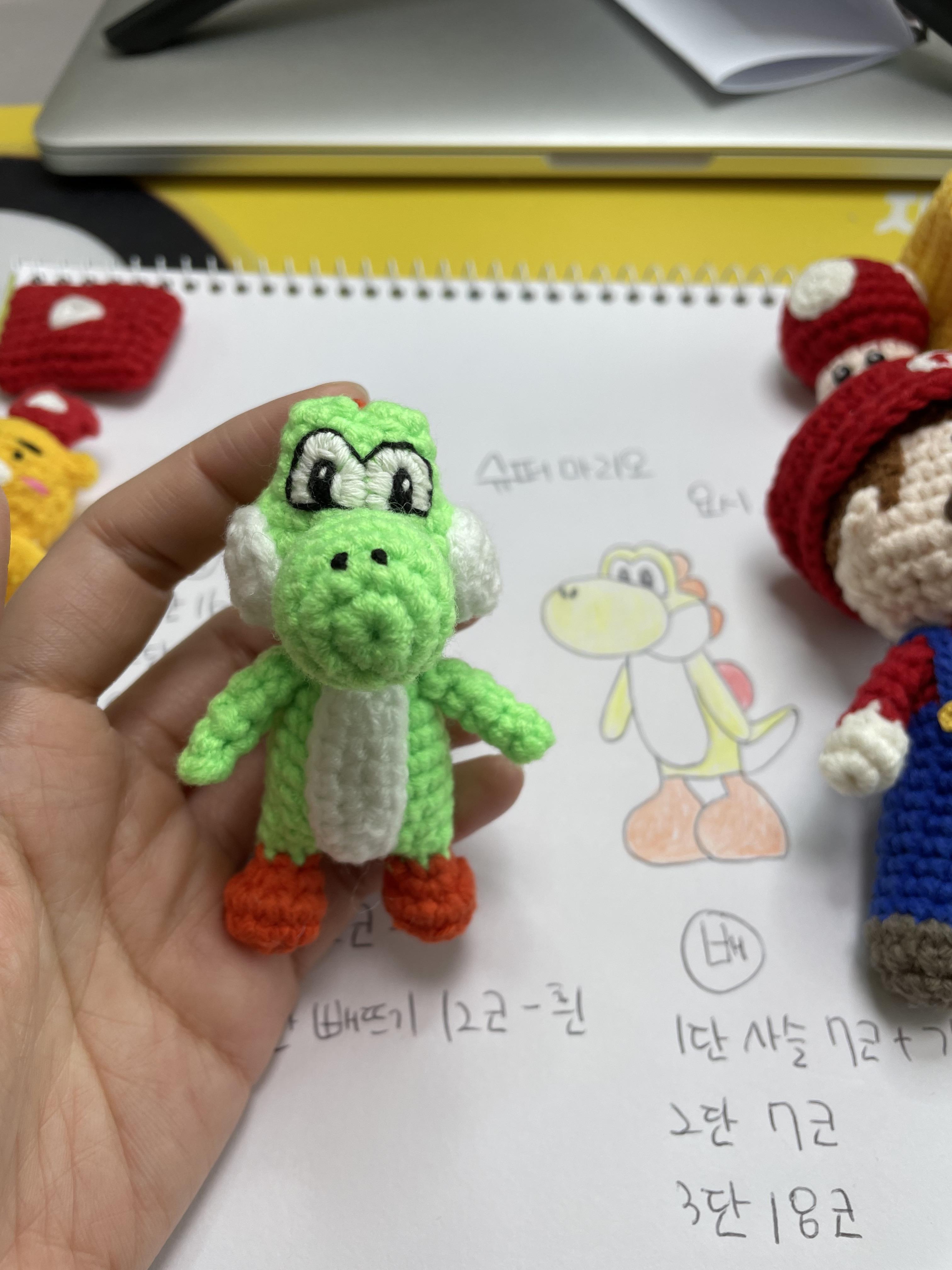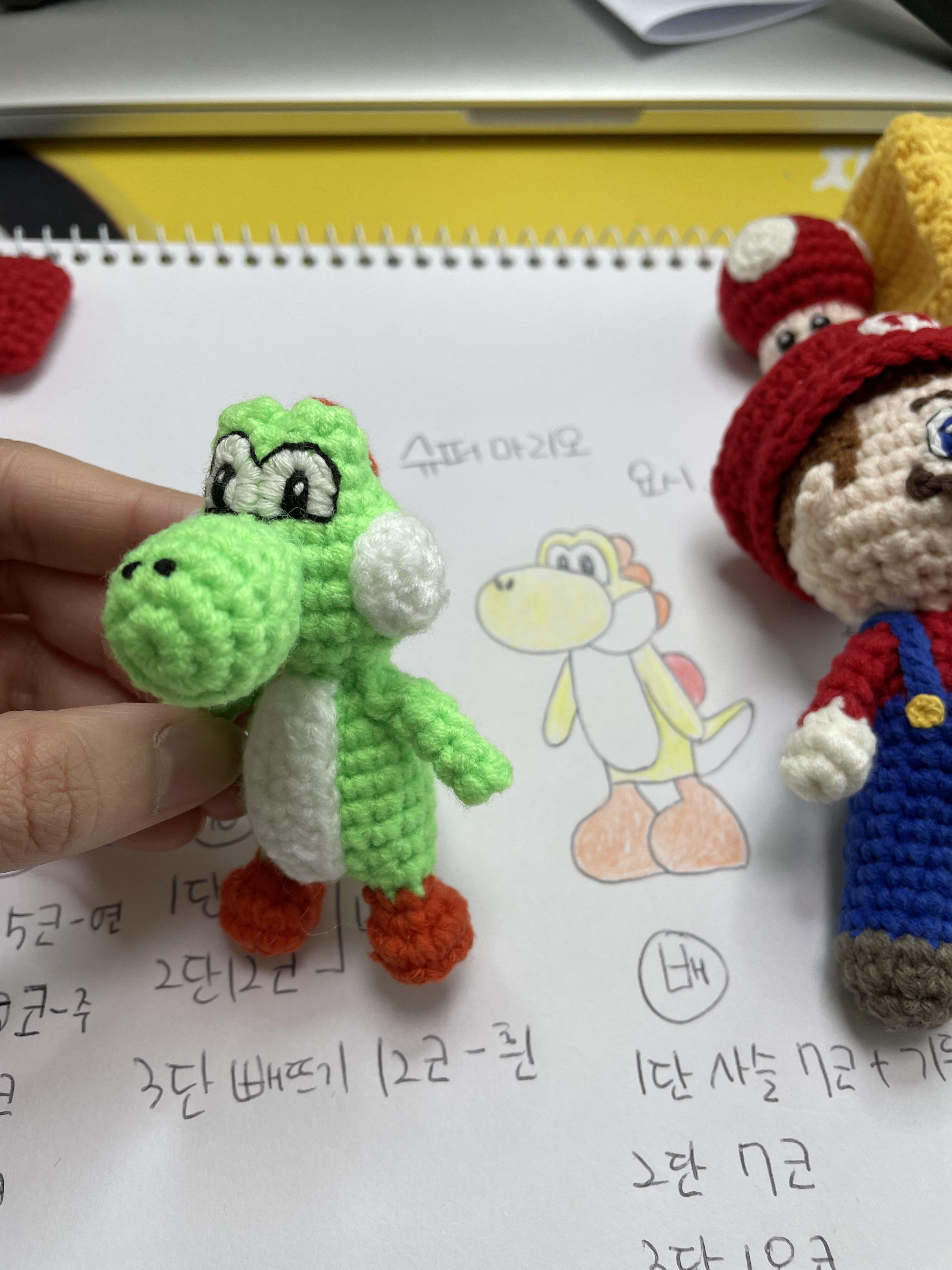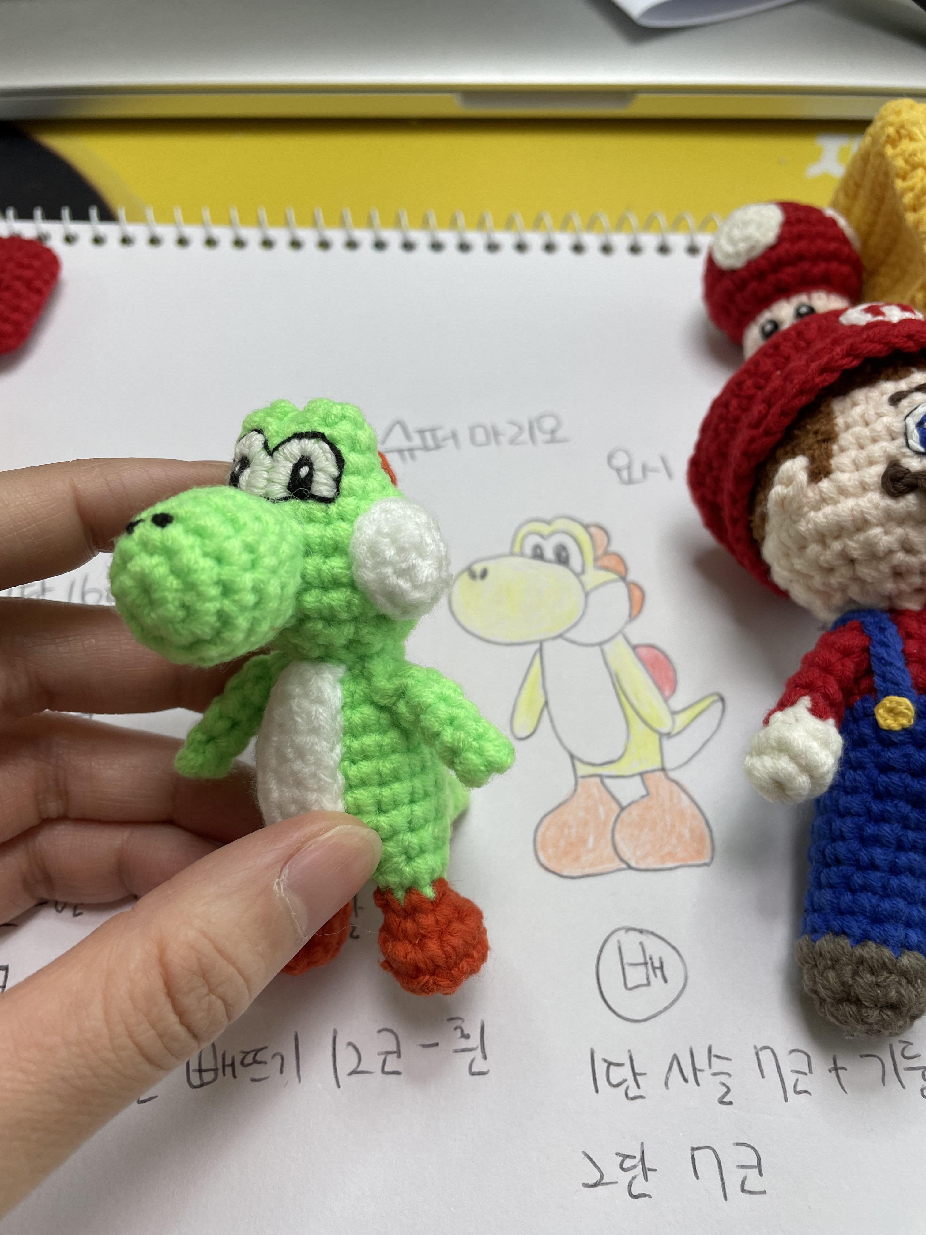 베개거지는 요즘 슈퍼마리오에 푹 빠져있어요. 그래서 관련 손뜨개 인형을 만들고 있습니다.