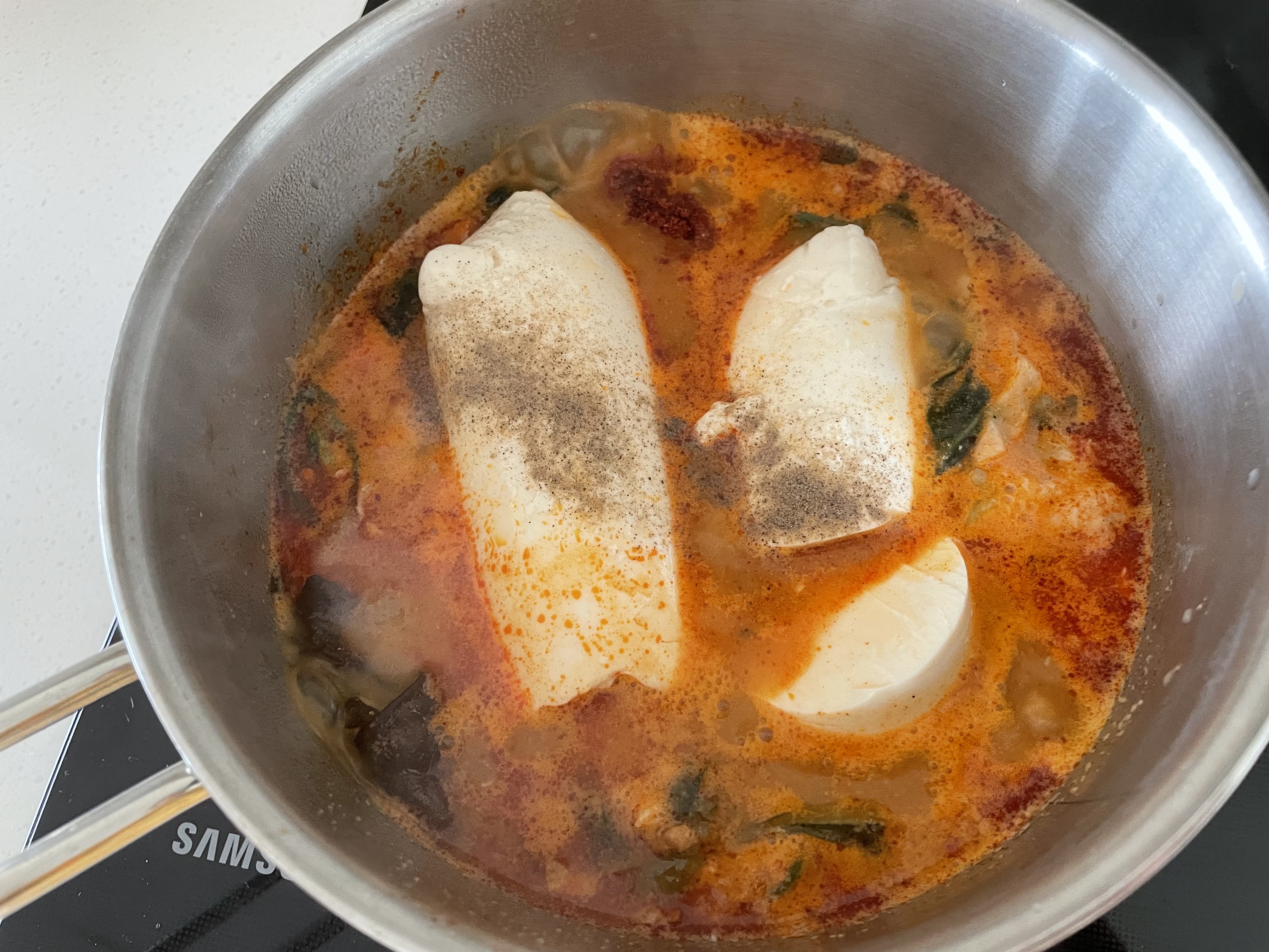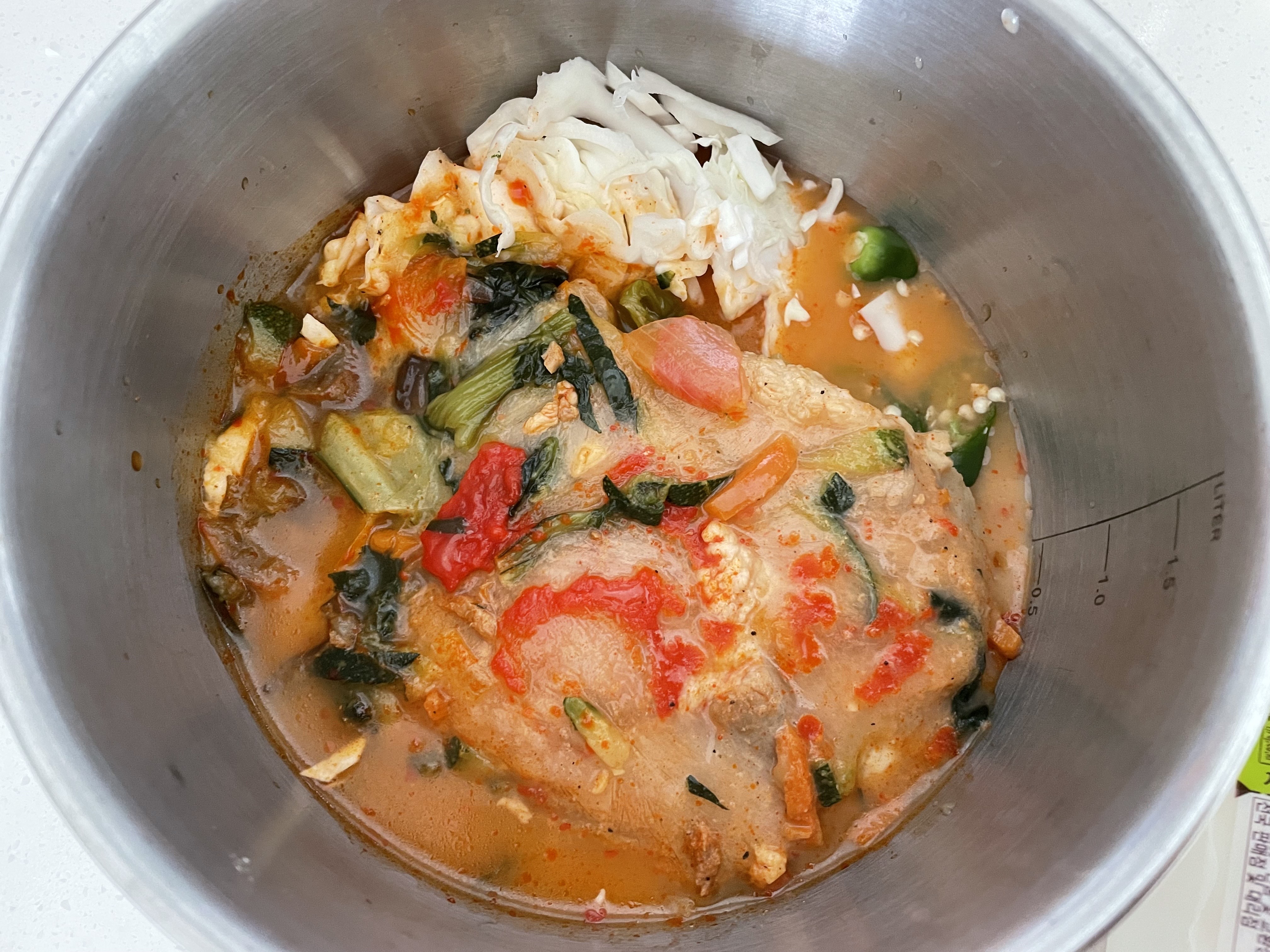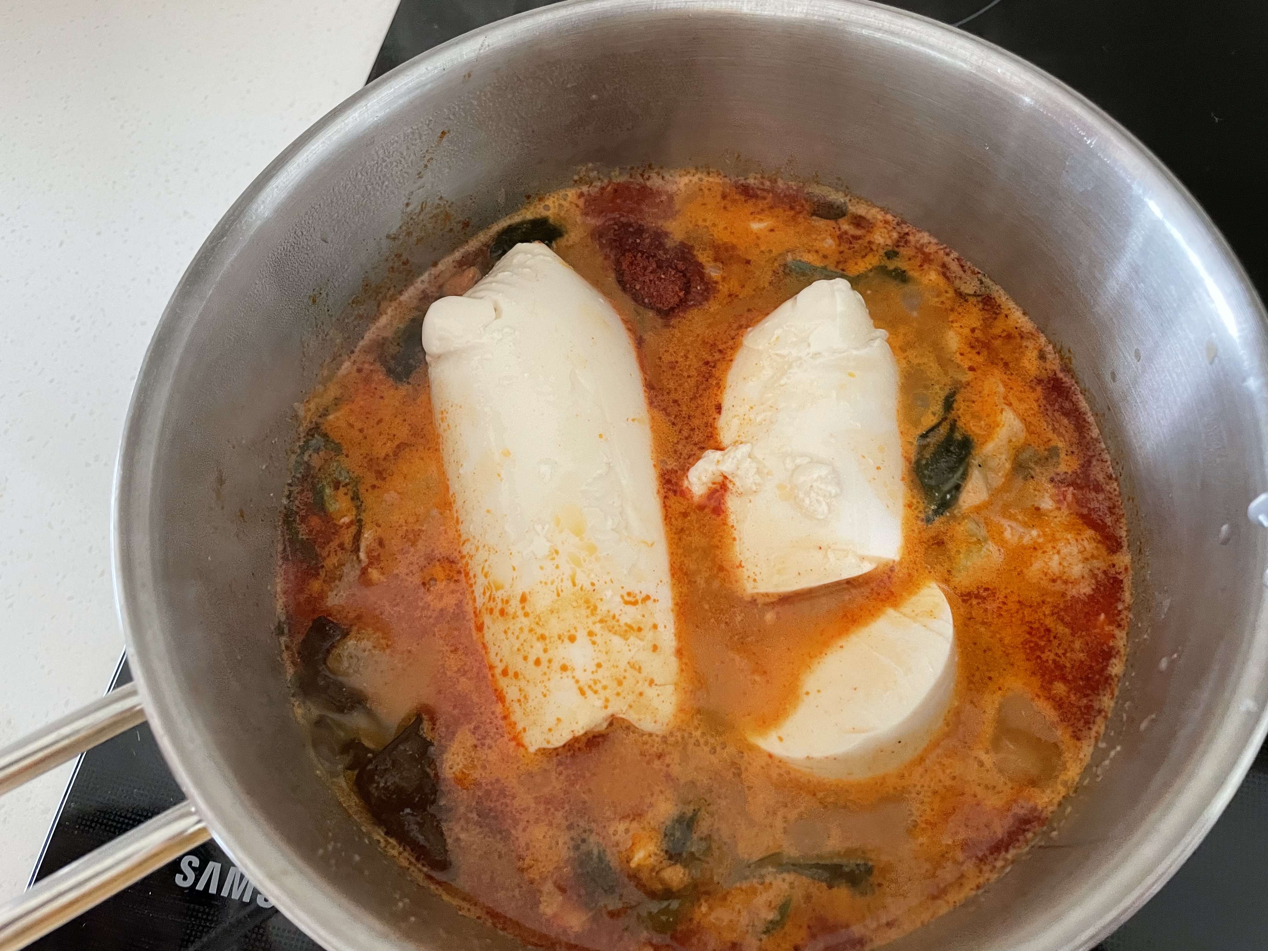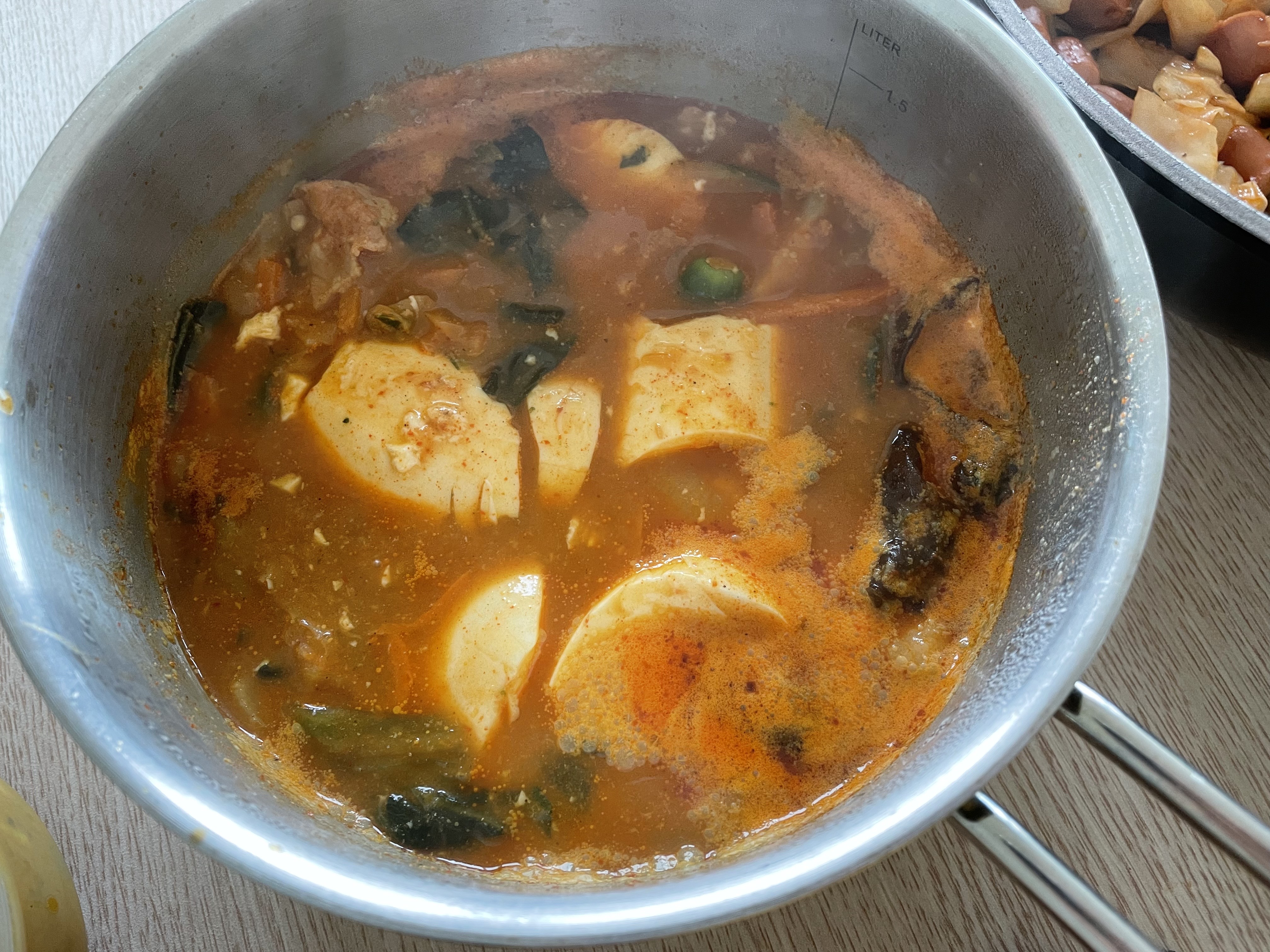 해동이 귀찮으면 중탕조리로 해주시면 되는데요. 저는 순두부랑 양배추랑 청양고추를 집어넣어야기때문에 번거롭더라도 직접가열로 합니다.