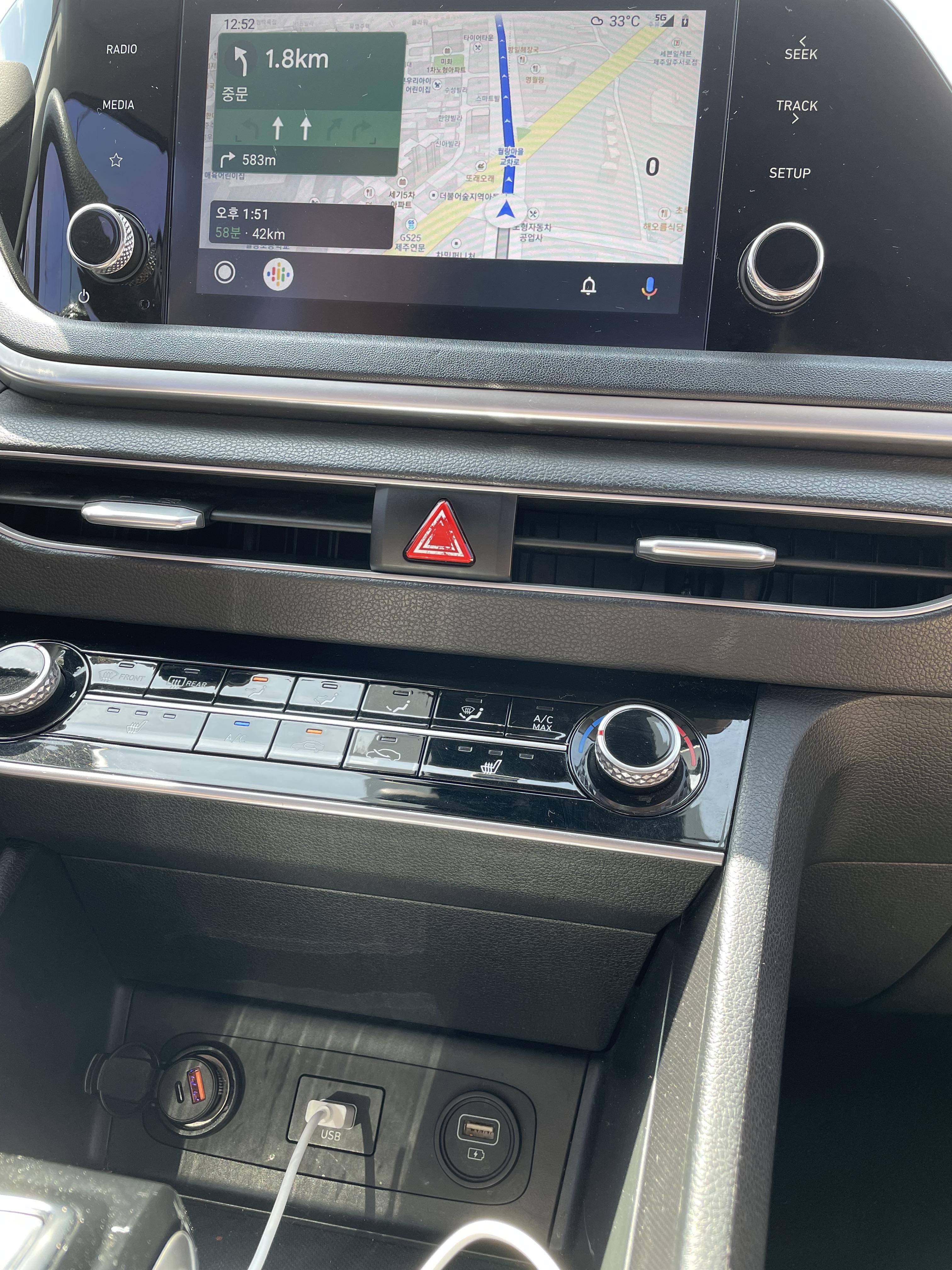 화면 밑에 USB단자가 있는데 그거랑 핸폰이랑 연결을 하고 티맵을 실행하면 차량 디스플레이 화면에 연동이 됩니다.