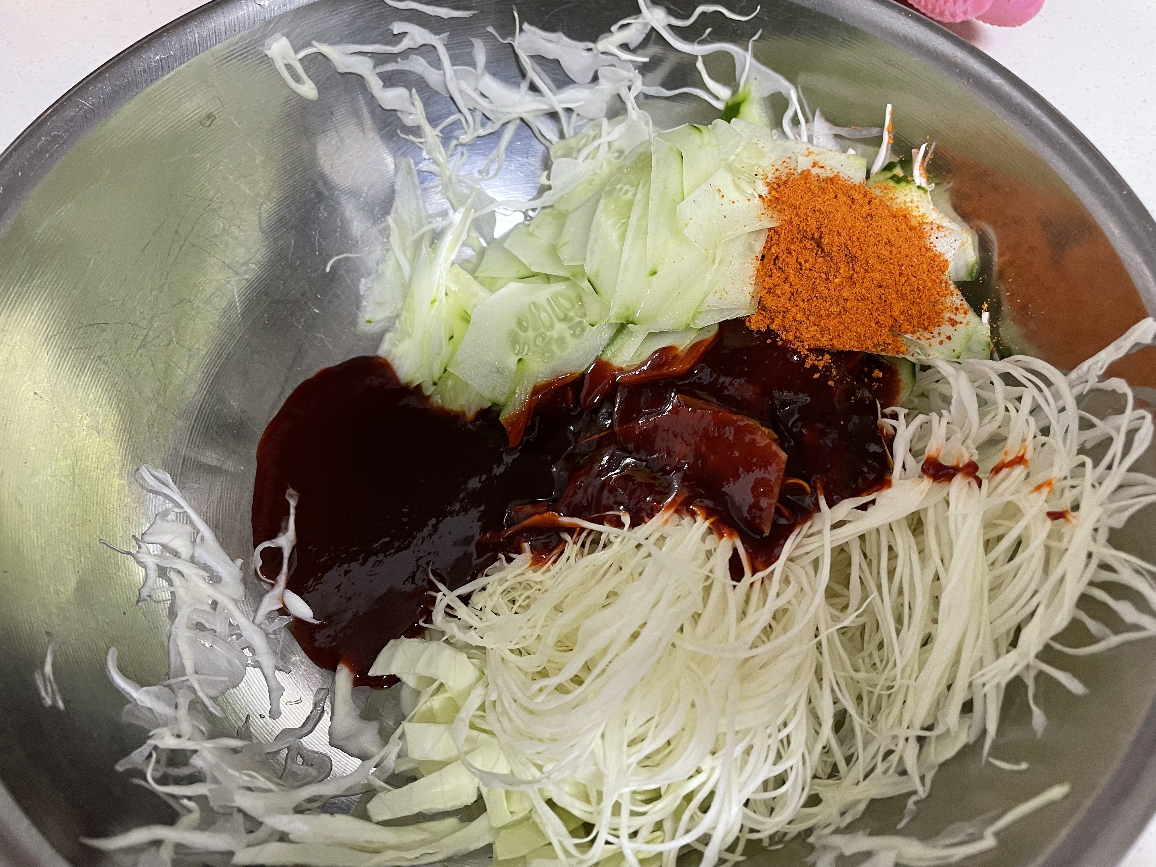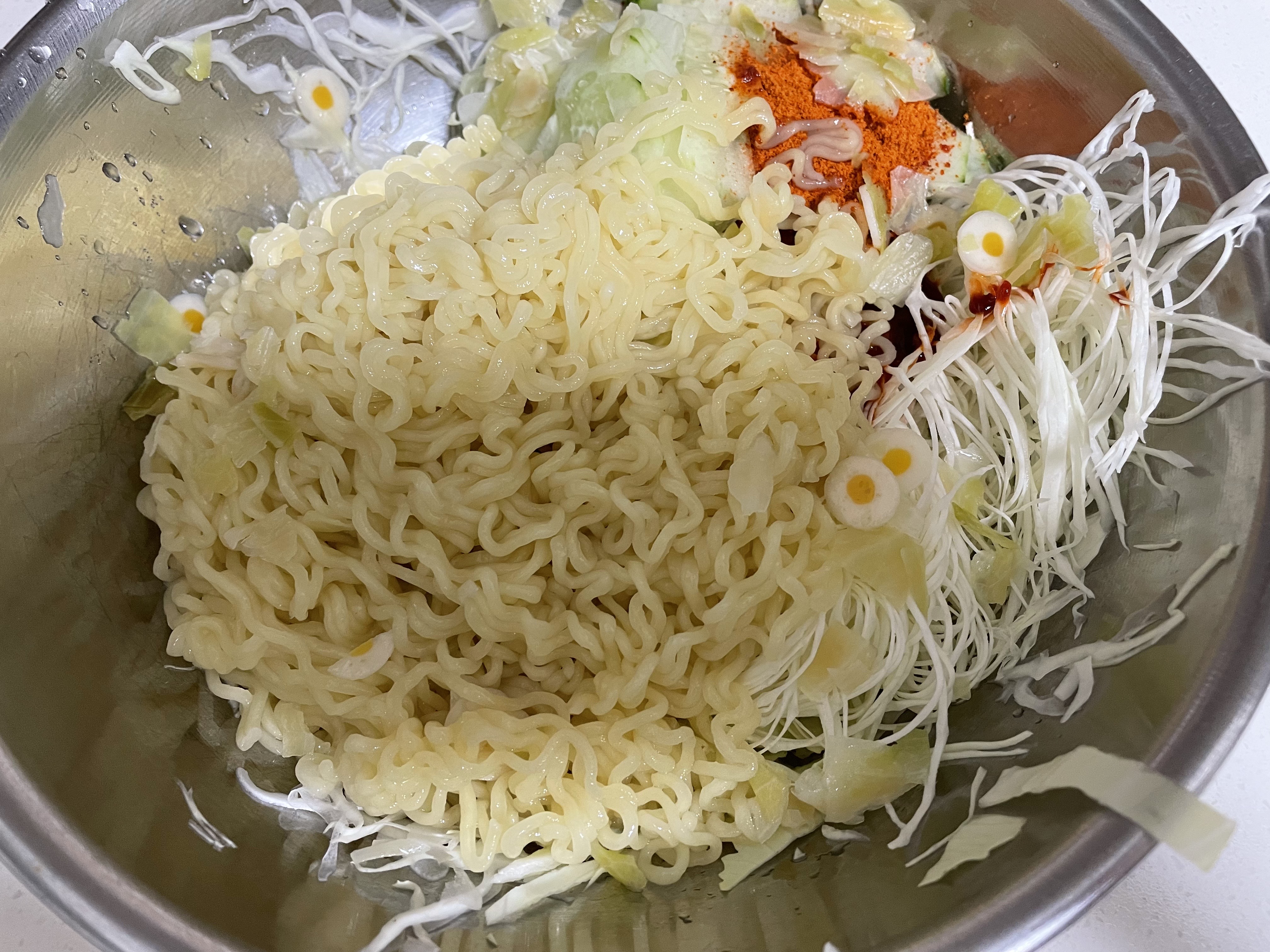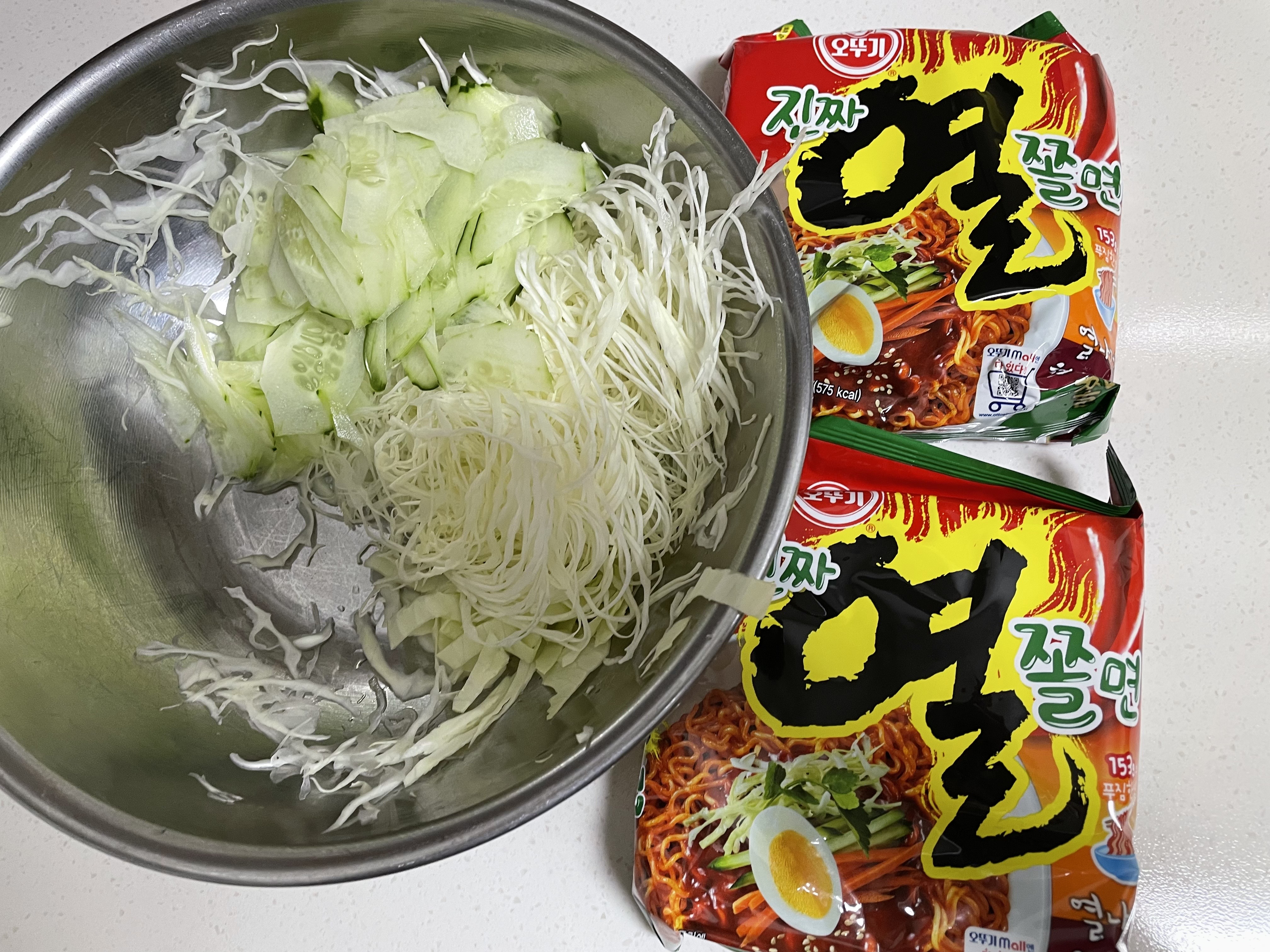 양배추랑 오이도 양배추채칼을 이용해서 솨솨솩~!! 야채양이 많아서 싱거울지도 모르겠지만 걱정이 없습니다.