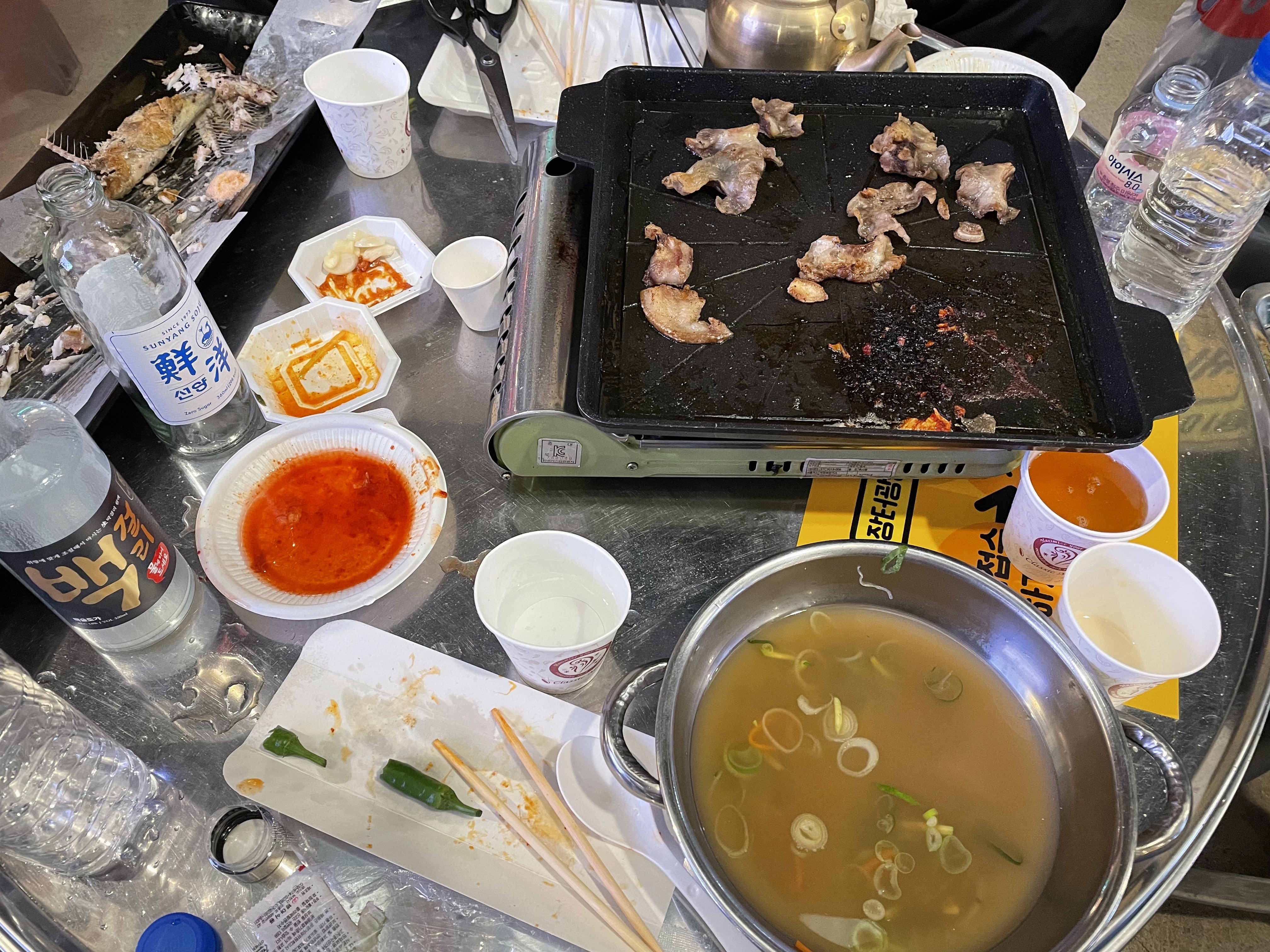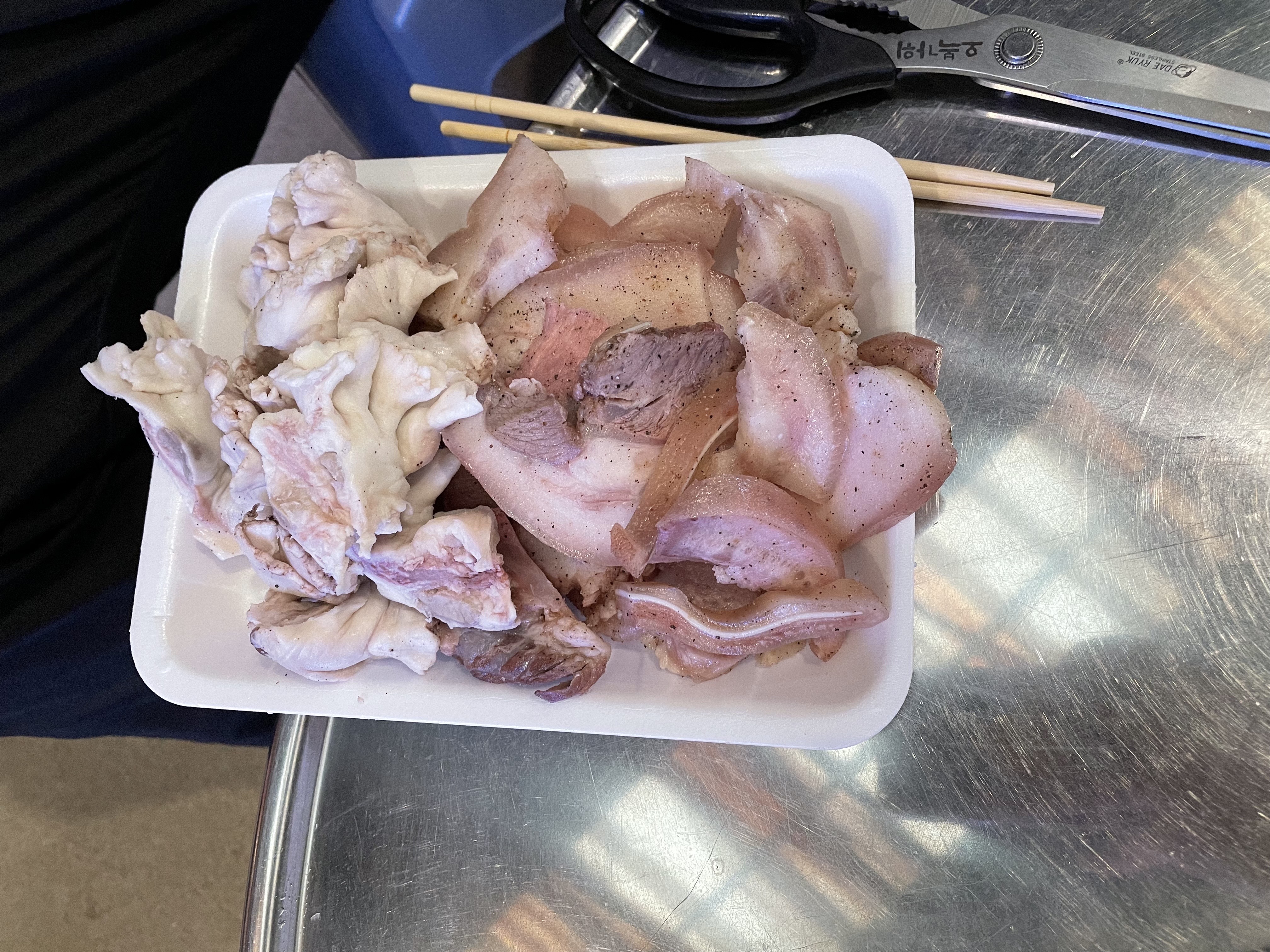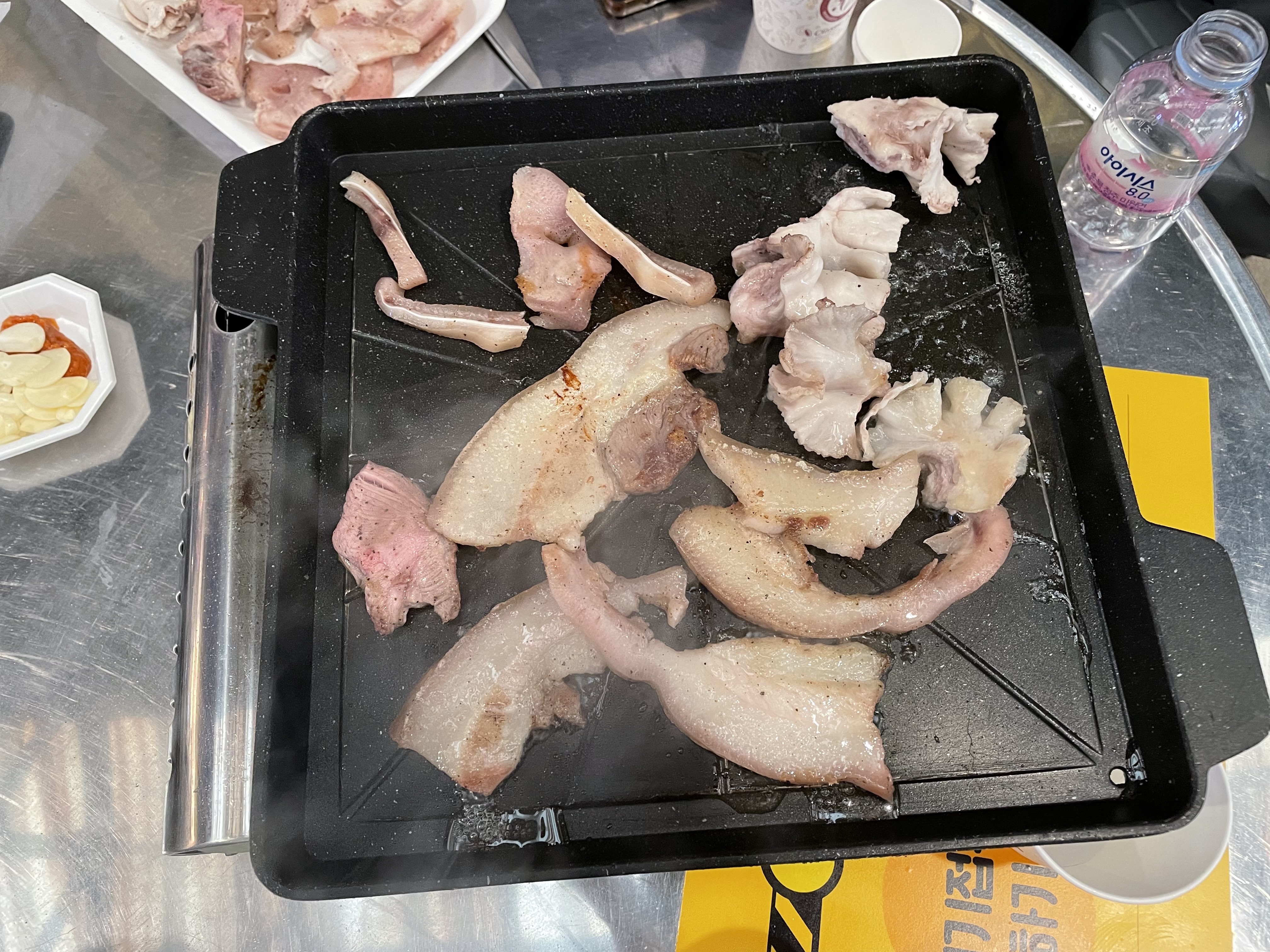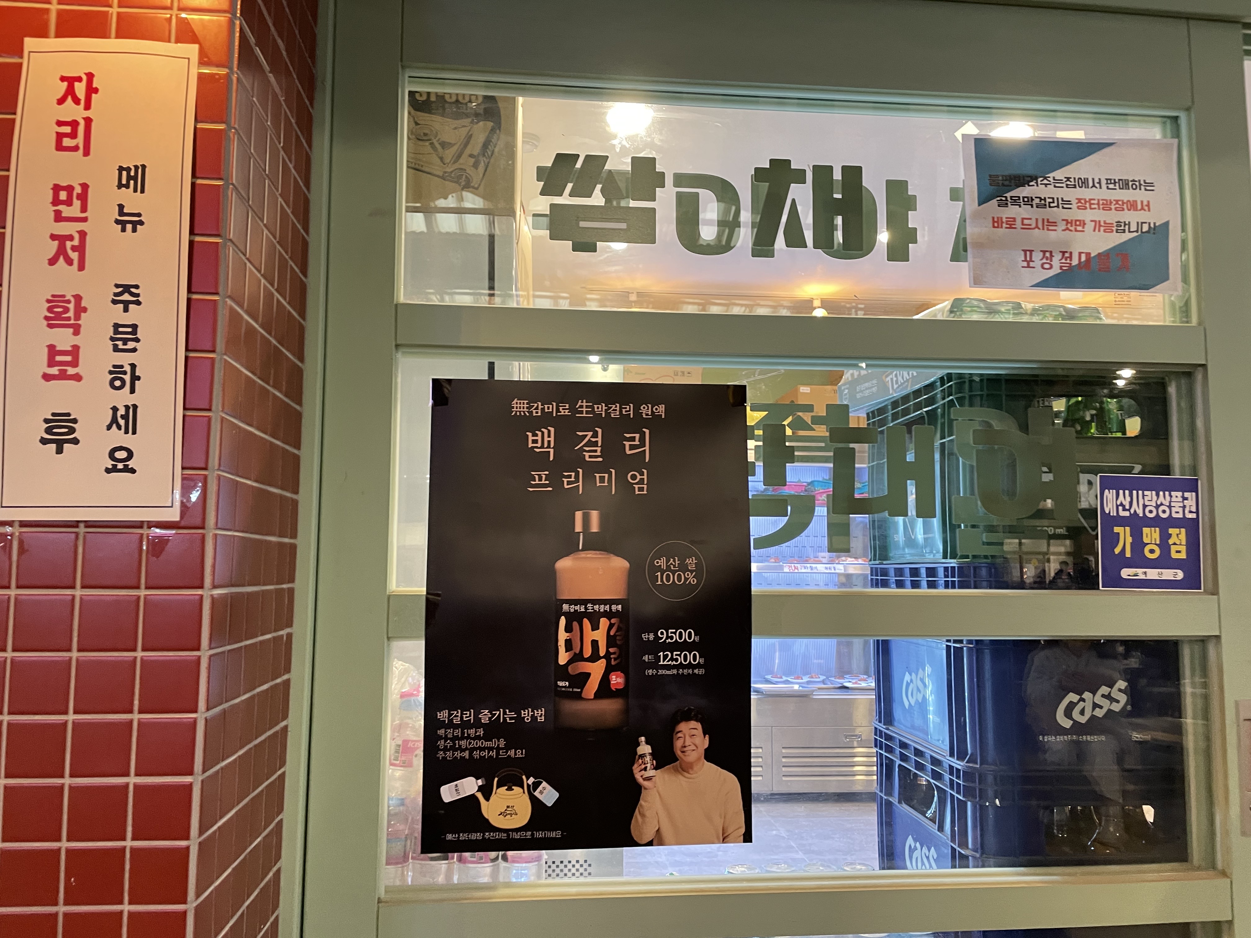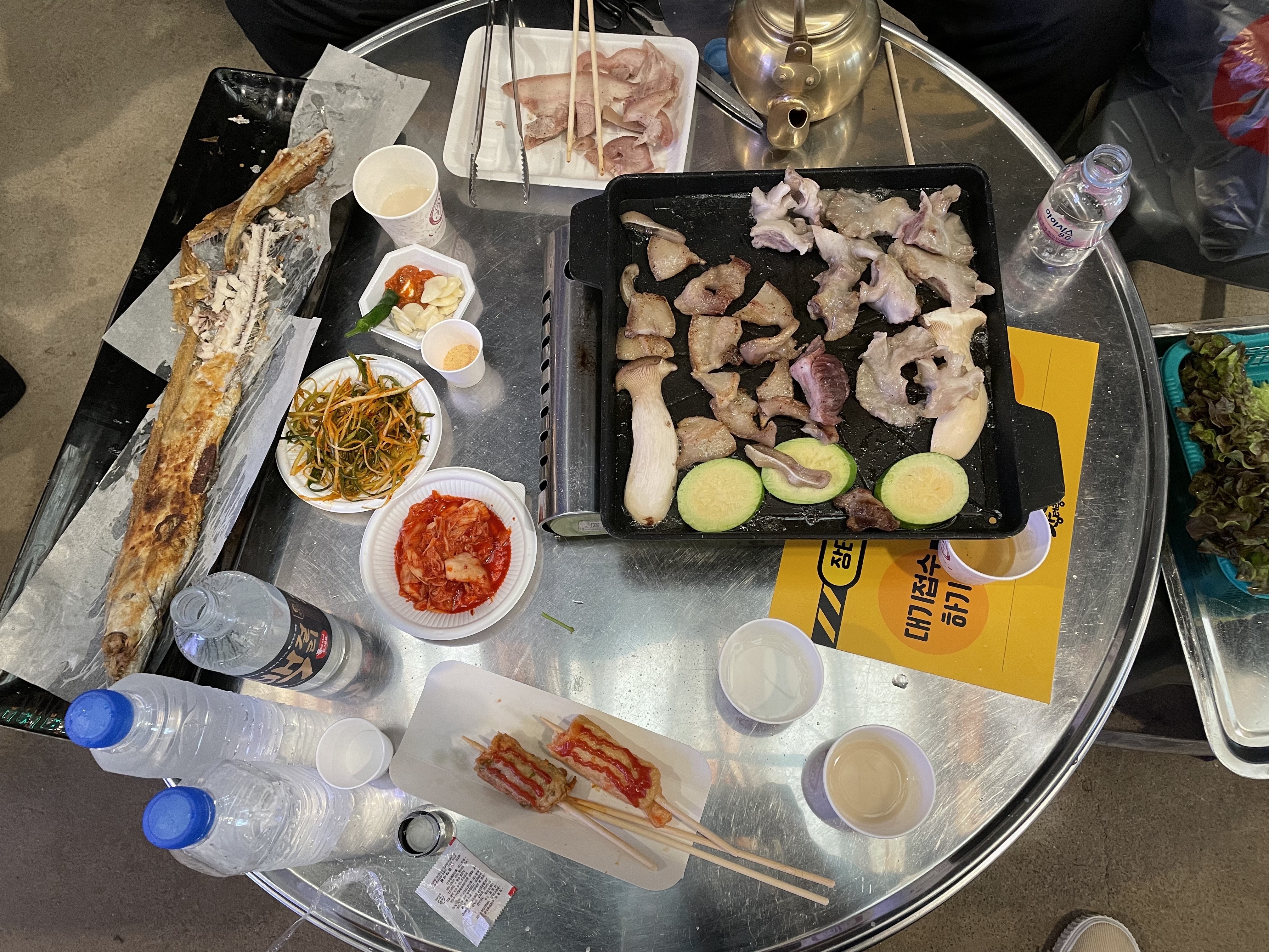 메인거리 테이블아니라도 가게 테이블에서도 먹어도 될거같긴한데 또 여기에서 파는 제품만 먹어야할거같고 그래서용.카페도 보입니다.거의다 먹는 신광정육점입니다.고기를 구입했으면 불판을 빌려야겠지요잉~백걸리도 꼭 먹는거같던데엥~ 단품은 9500원 세트는 12500원입니다.주류도 다양하게 있어요.2인상차림을 구매해줬습니다. 1인당 5천원으로 두명이니께롱 만원~백걸리 세트구입하면 요 주전자랑 쪼고마한물을 세트로 줍니다. 요 주전자는 놓고가셔도되고 가지고가셔도되는데 당연히 가지고 가야죠!!상차림이랑 백걸리주전자세트 구입완료.신광정육식당에 들러서 고기를 구입합시다. 뒷고기 300g 도래창 200g 구입했어요.