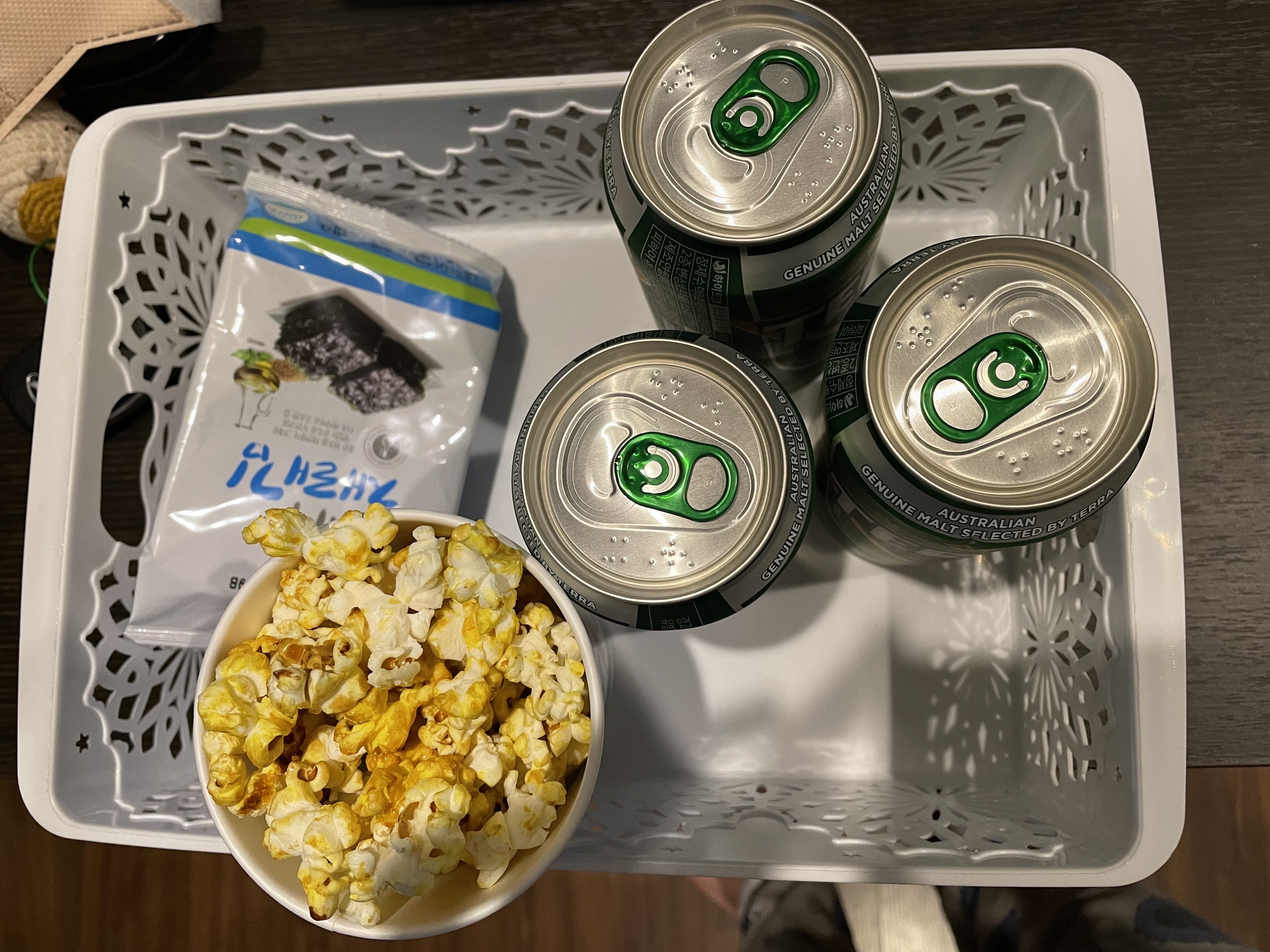 맥주랑 팝콘 진짜 잘 어울려요. 이히이히히