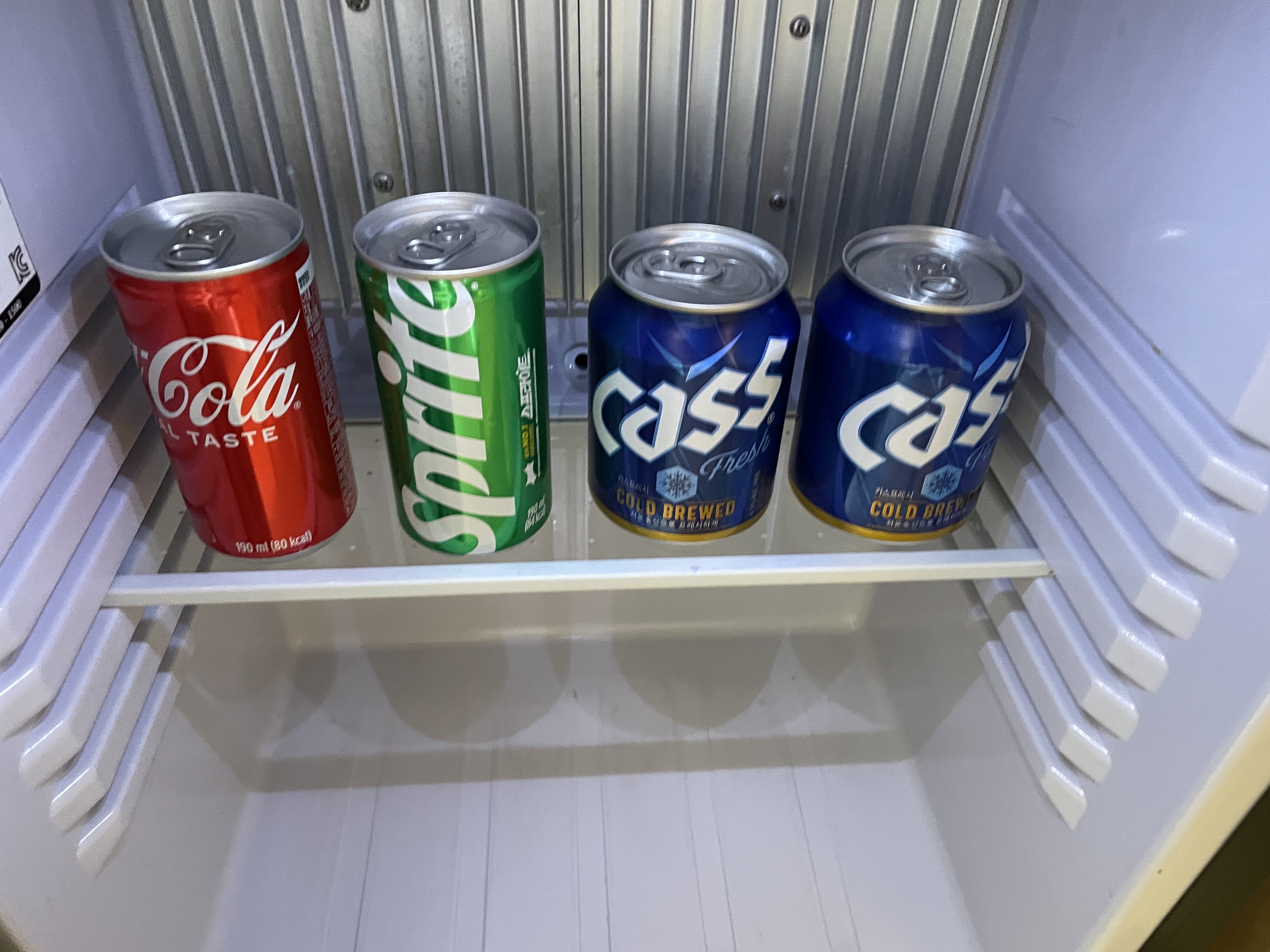 콜라, 스프라이트, 미니카스2개가 들어가있구요. 사진에는 없지만 감자과자랑 생수2병이 들어가 있습니다.