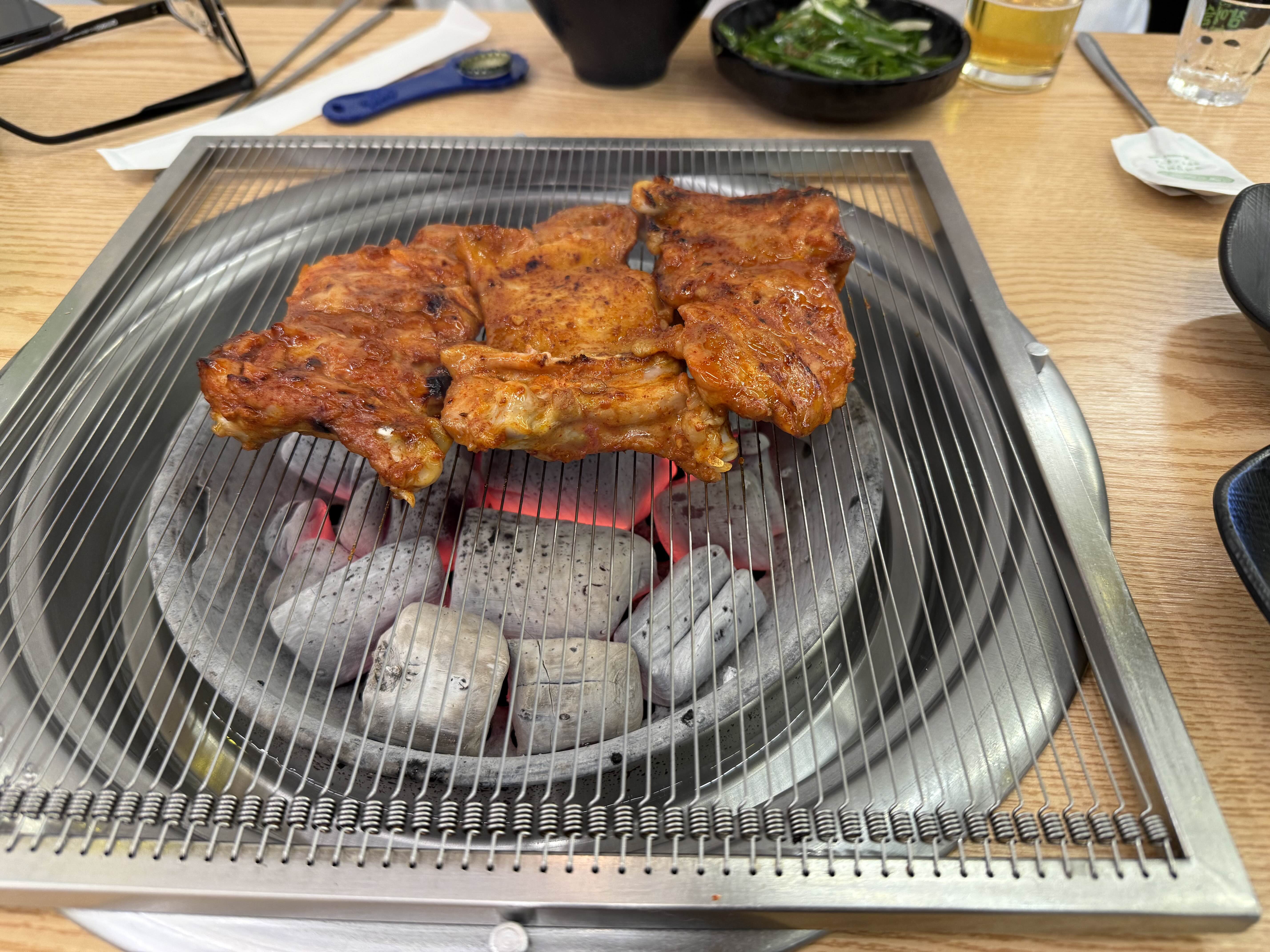 처음에 숯불이 쌔서 타니까 가장자리에서 천천히 익혀주세요.